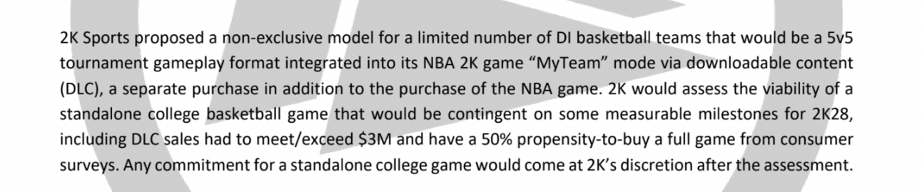 This new memo is consistent with that assessment; 2K’s proposal was for a “non-exclusive model for a limited number of DI basketball teams that would be a 5v5 tournament gameplay format integrated into its NBA 2K game.” 2K promised to assess the viability of a standalone game as early as 2030, assuming the initial release met certain milestones. It also proposed a limited number of teams: 16 total from the men’s and women’s game in Year 1, 32 in Year 2 and 68 in Year 3.