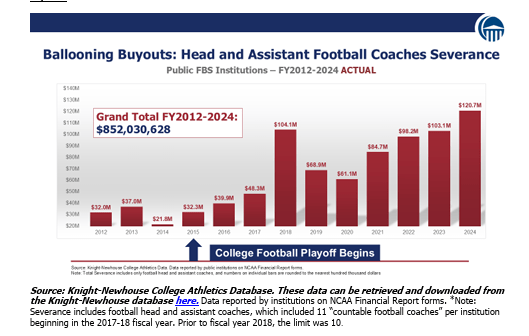 The Knight Commission has been tracking spending on coach severance payments for the last several years, showing that spending has increased every year since COVID-19, hitting a whopping $120.7 million across FBS in fiscal year 2024.