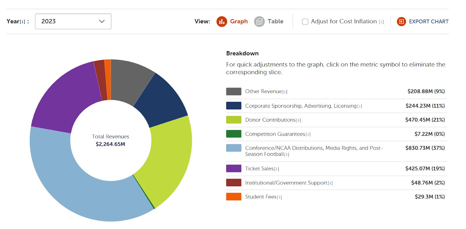 There are a few other ways that larger programs are able to bring in revenue. Schools can earn NCAA “units” for successful performances in the Men’s and Women’s NCAA basketball tournament, payments that can extend into six and seven figures. Athletic departments ask for donor gifts, either in cash or corporate in-kind partnerships. Schools can also rent out their athletic facilities to other organizations (like high schools), sell parking spaces, hot dogs and programs, hold sports camps, and license their intellectual property for stuff like t-shirts or video games.
