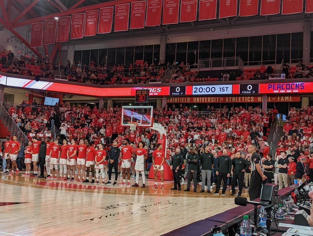 Before the game, the athletic department reached out to every living ex-Fairfield basketball player they could, inviting them to see the new arena. Over a hundred came, individuals whose careers spanned several decades. They were asked to sign a print of the new basketball court, and were recognized and celebrated during the game.