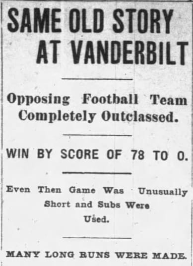 The last time Vandy dropped 40 or more points on Alabama in a win? That, my friends, requires us to go all the back to the Paleolithic era of college football. The 1906 Vanderbilt Commodores, perhaps the first truly great major college football program in Southern history, demolished Alabama, 78-0. That game remains the most lopsided loss in Crimson Tide history.