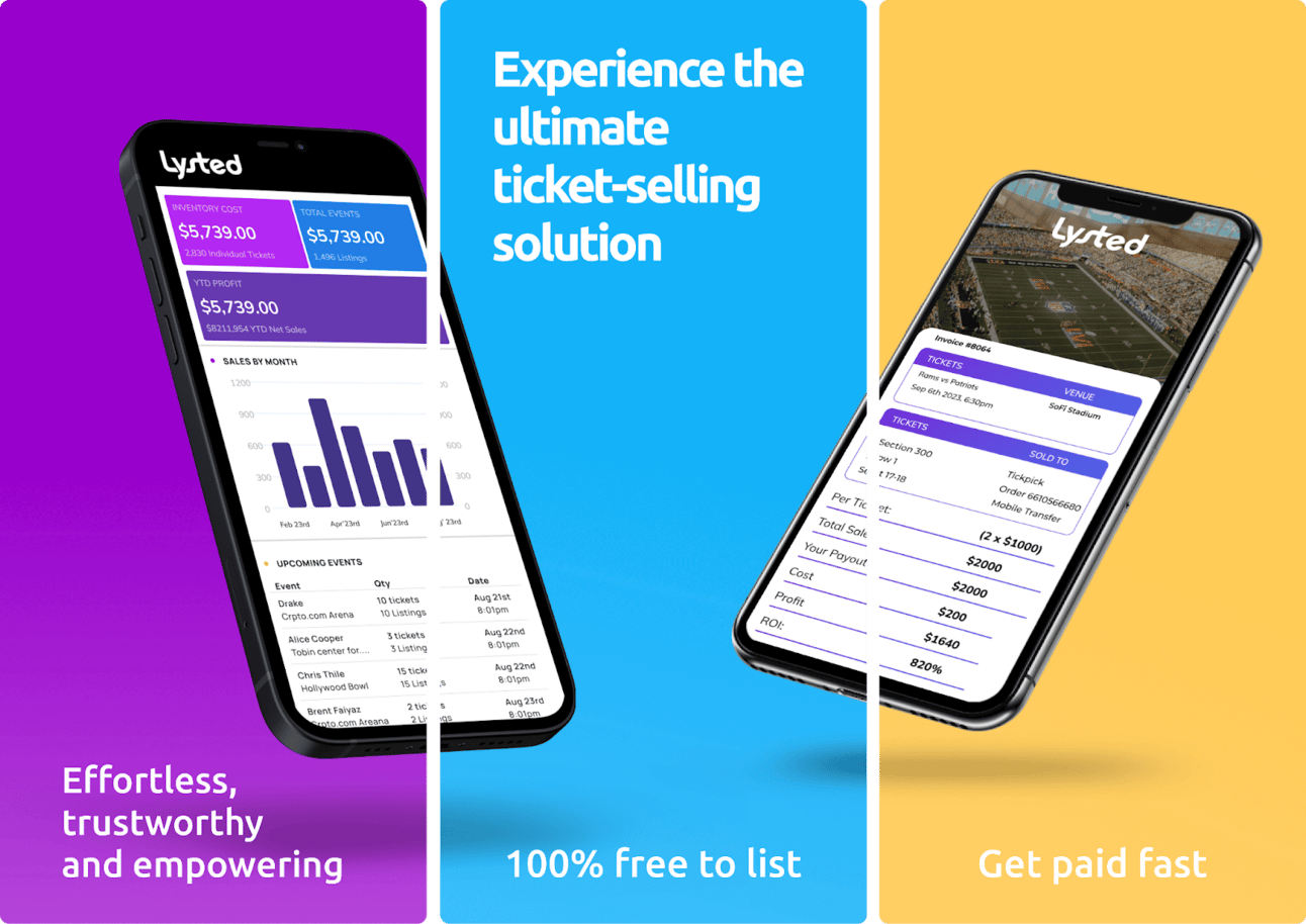 Lysted allows you to list your tickets effortlessly across top platforms like Stubhub, Ticketmaster, Seat Geek, and VividSeats. With fast payments, competitive fees, automatic updates and synchronized listings, managing your side hustle is a breeze. List your tickets today and see why 30k+ resellers swear by this platform.