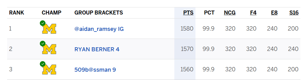 But ESPN doesn’t let me look up who these people are! So if you are one of the top three bracket finishers, please email me at [email protected] so we can get you your prizes!