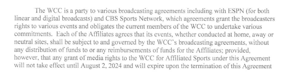 Thanks to an Open Records Request, Extra Points has obtained a copy of the actual contract between the WCC and the remaining Pac-2 institutions, which sheds more light on the nature of the agreement. This contract is dated Dec 21, 2023, or the day before the official WCC press release.