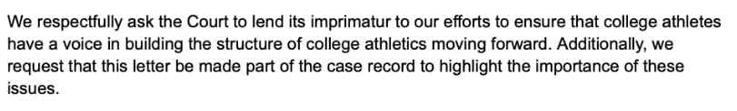 The three named plaintiffs in the case: Grant House (ASU Swimming), Sedona Prince (Oregon/TCU WBB) and Nya Harrison (Stanford Soccer), wrote a letter to Judge Wilken, dated December 2nd.
