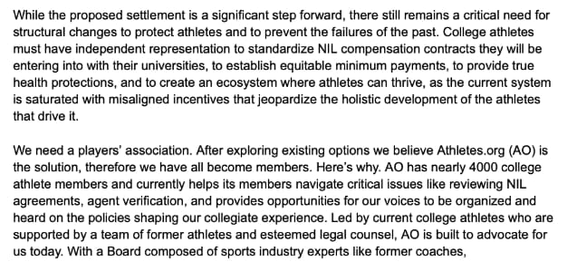 That letter called for college athletes to have “independent representation” in conversations surrounding NIL regulation, health protections and minimum payments. Specifically, they say that Athletes.org should be that solution.