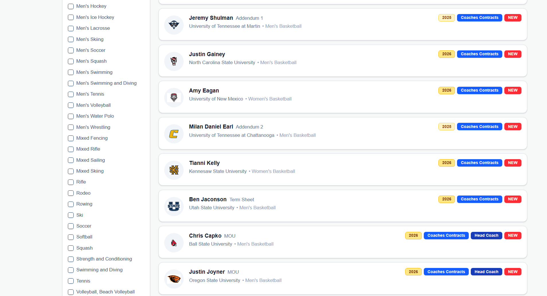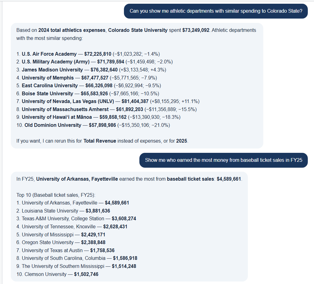 Dramatically increase our data set for game contracts. We’re currently adding contracts for football (FBS and FCS), men’s and women’s basketball, baseball, softball and volleyball. If there’s user demand, we’ll expand to other sports. We want to get to a point where users can search average (and range) of game guarantees across particular sports/conferences, and potentially improve their scheduling processes.