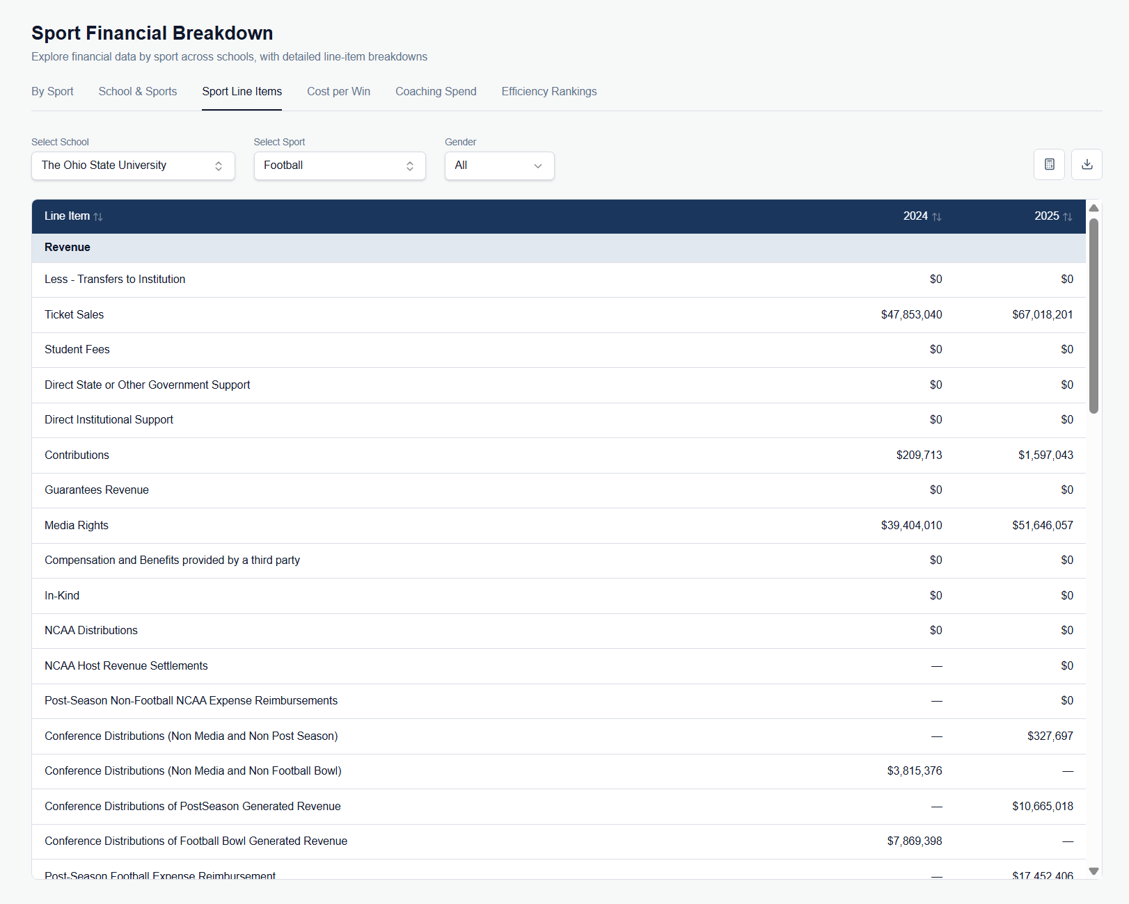 Finally, we’ve built tools to allow users to look up the itemized spending/revenues of specific programs at specific schools. So as an example, here’s a segment from my alma mater, Ohio State, and its football program: