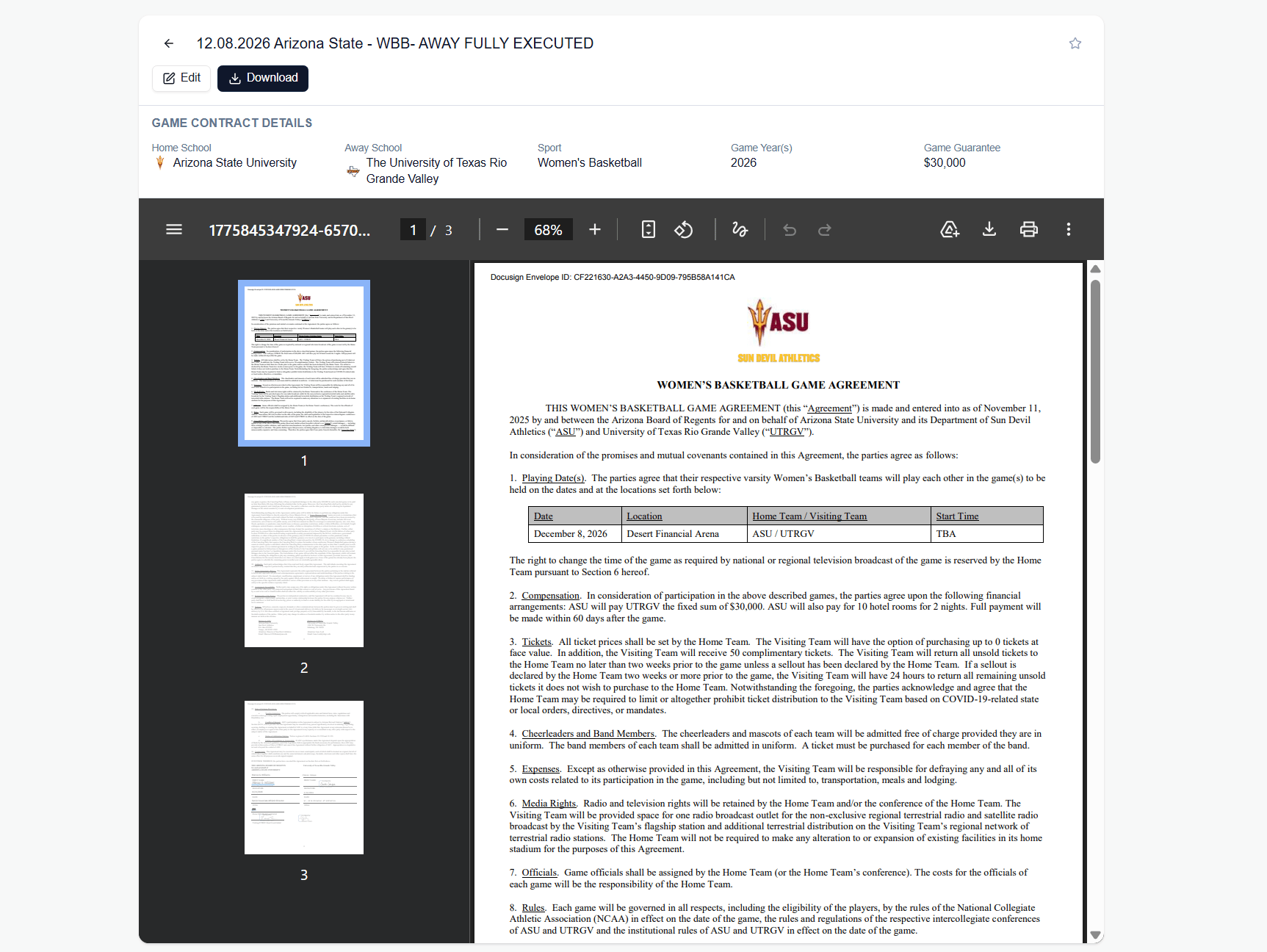 Just click on a contract you want to inspect, and you can see the relevant info right above the actual PDF. For our example, we can see here that Arizona State will pay a $30,000 guarentee to the UTRGV women’s basketball team for a game on December 8th, 2026. Is that game announced yet? Well, if not, surprise! We just broke some news.