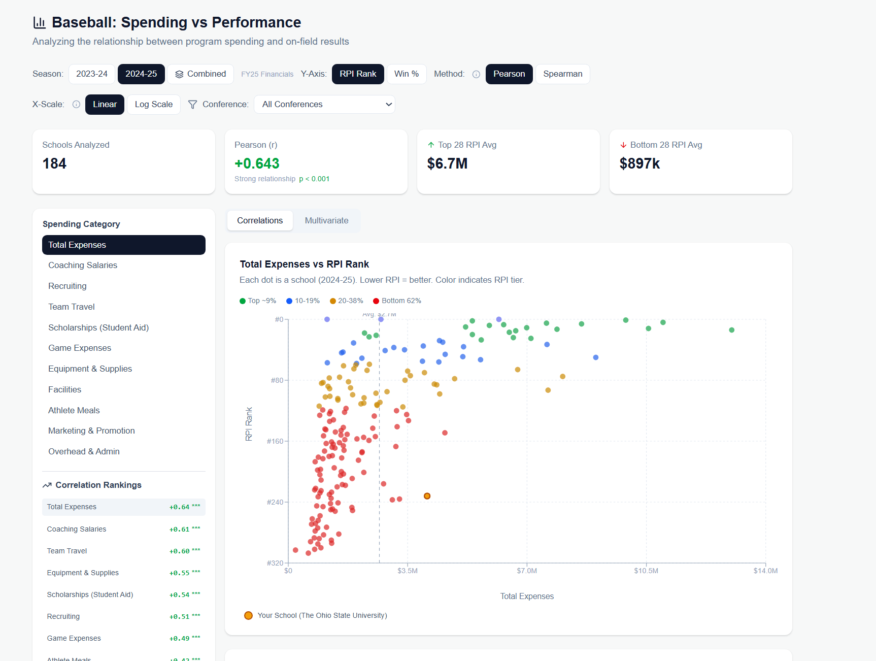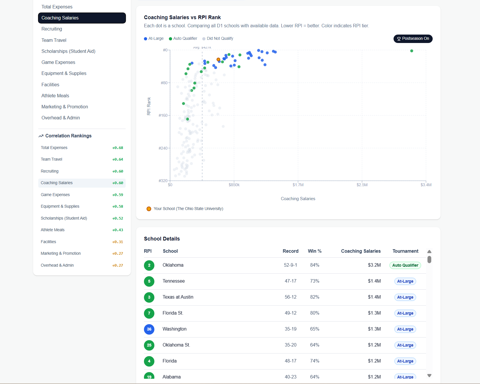 Within the analytics page, you can run different types of statistical models, and chart how various MFRS line items line up with RPI ranking, NET, postseason appearances, and other metrics. You can easily create tables to rank teams not just by total spending, but by specific line-items, as well as postseason results. Like this, for the 2025 softball season and spending on coaching salaries: