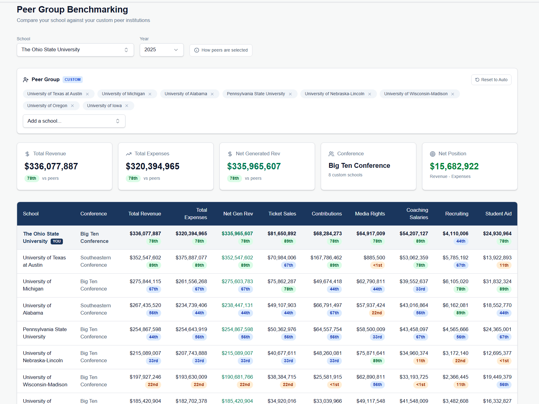 The computer will try to build a benchmark table for you, based on conference affiliation, budget ranges and sport sponsorship. But with a few clicks, you can add or remove whoever you want.