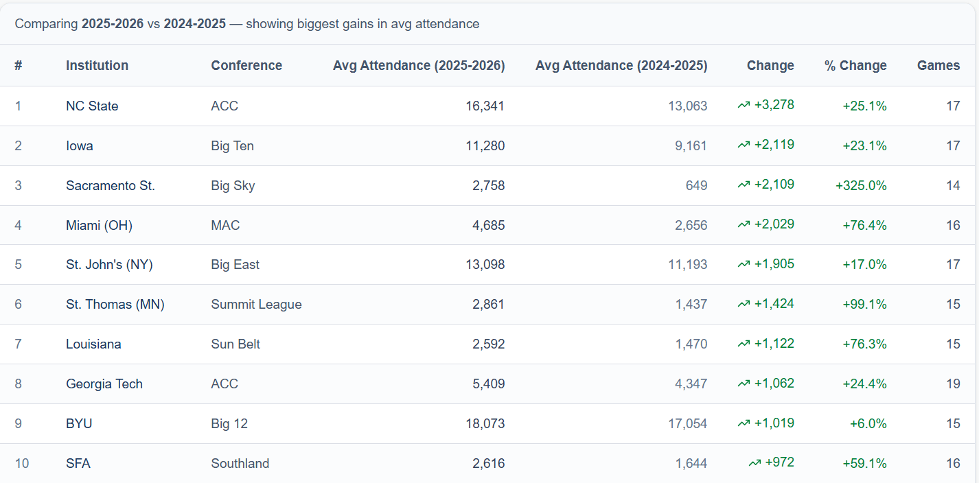 You can also use these forms to analyize official attendance data (currently for FB, MBB, WBB, Baseball and Softball), as well as Directors Cup rankings. For example, I can now look up the men’s basketball programs who saw the largest % increases in attendance. That includes big programs (NC State, Iowa, St.John’s BYU), and mid-majors (Miami OH, Sacramento State, St. Thomas, etc). Wake, Memphis, Pitt, Texas A&M and Penn State declined the most.