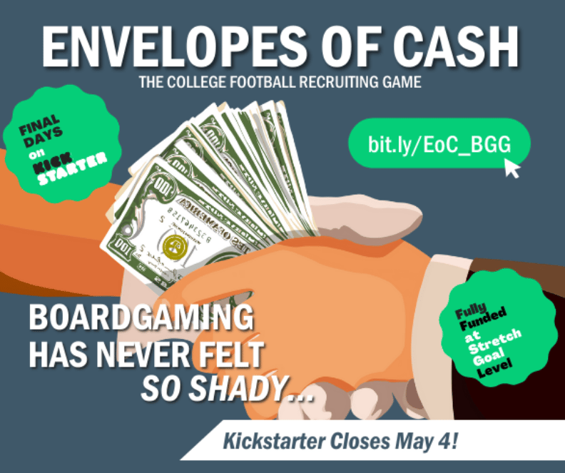 Envelopes of Cash is a Euro board game with a very American theme: college football recruiting. Players take the roles of Head Coaches, trying to sign the best recruiting class. To do so they must marshal all the tools available to them, including the eponymous envelopes full of cash and other impermissible payments, donations from boosters, and marketing campaigns, all to maximize their Recruiting Ranking Points.
