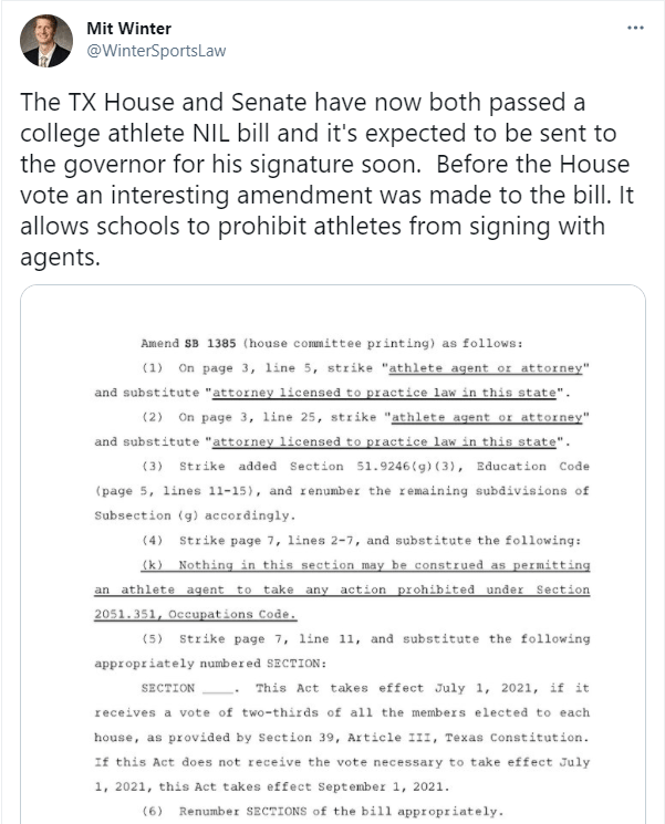 So why add this clause at all? It could be a result of lobbying from the Texas Bar or local agents, since it would provide a significant business advantage for agents who also happen to be attorneys who passed the Texas Bar. It could be a result of schools, hoping to limit outside influences. It could be a mistake, a clause that essentially gets ignored, like the Georgia NIL law granting schools the ability to require athletes to pool portions of their earnings (every FBS school in Georgia said they do not plan to do this).