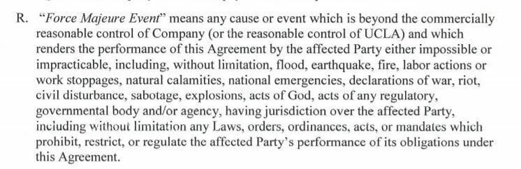 Under Armour has signed other contracts, and many of those contracts do, in fact, have specific force majeure clauses. Here’s how force majeure is defined in Under Armour’s contract with UCLA, for example: