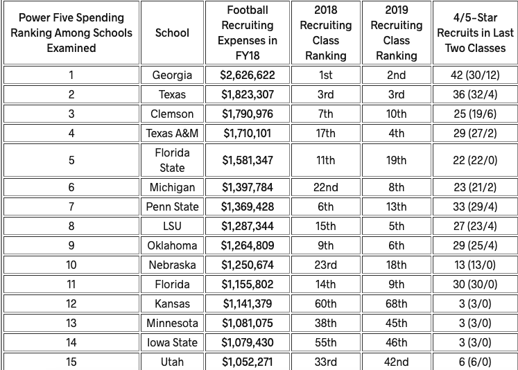 You may have seen this recent post from Stadium. They FOIA’d several dozen schools to figure out what the relationship is between recruiting spending and quality of recruiting classes. It’s been going around college football Twitter for a bit.