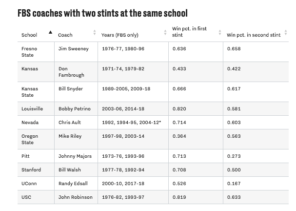 As my friend Bill Connelly pointed out here, coach reunions usually don’t work out that well either.