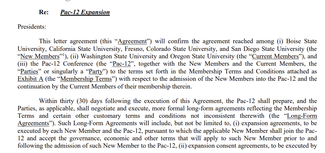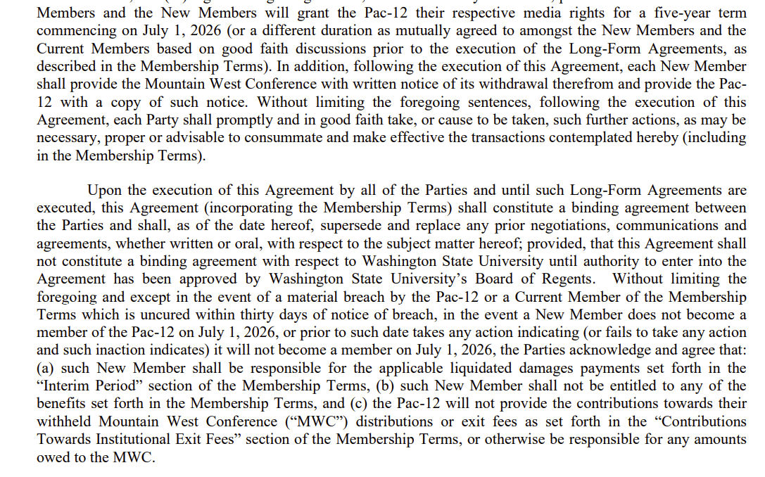 This letter, in so many words, explained that the Pac-12 would prepare a longer, more formal document within 30 days, that would go over some of the very specific governance protocols for the conference and its new members. The initial letter also states that upon the execution of this agreement, each of the Pac-12 schools will grant the league a five year grant-of-rights, starting in 2026, or “a different duration as mutually agreed to amongst the New Members and the Current Members based on good faith discussions prior to the execution of the Long-Form Agreements, as described in the Membership Terms.” It also lays out what happens to any of the new members if, for whatever reason, they decide to not join the Pac-12 by 2026.